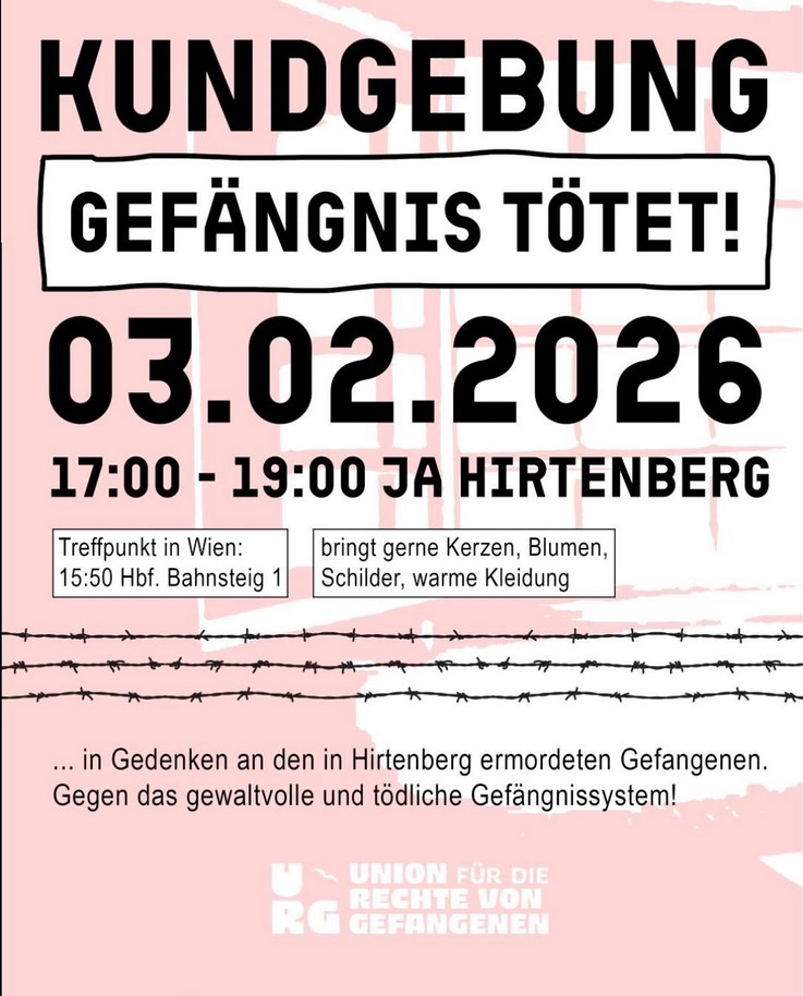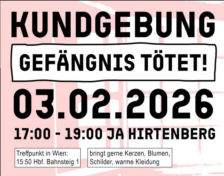Kundgebung „Gefängnis tötet!“ 3. Febr. 26, 17 – 19 Uhr, Justizanstalt Hirtenberg
